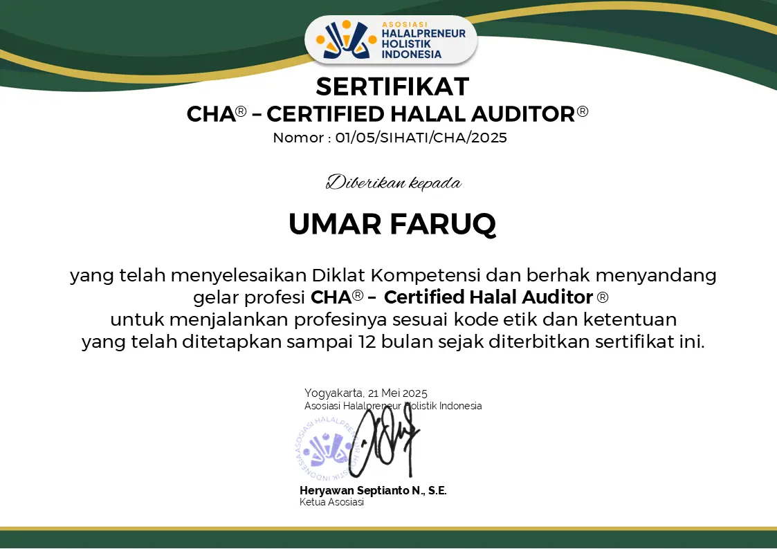 CHA® juga telah memiliki sertifikasi Sertifikat Kompetensi Profesi dari BNSP sesuai dengan SKKNI Auditor Halal.